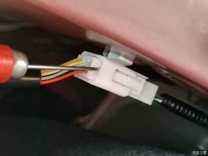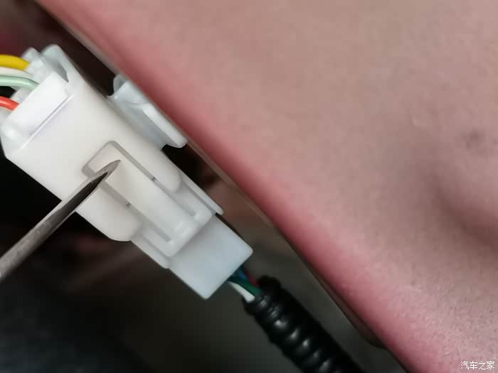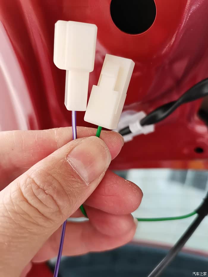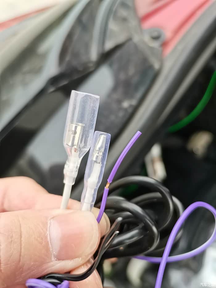 图中紫色线是记录仪配的接倒车灯正电的线!左边两个公母端子是用来延长这根线的,线束上的短!右边这个剥开线头的是用来缠到倒车灯正电上的!我才不这样破线施工,我给换了!
