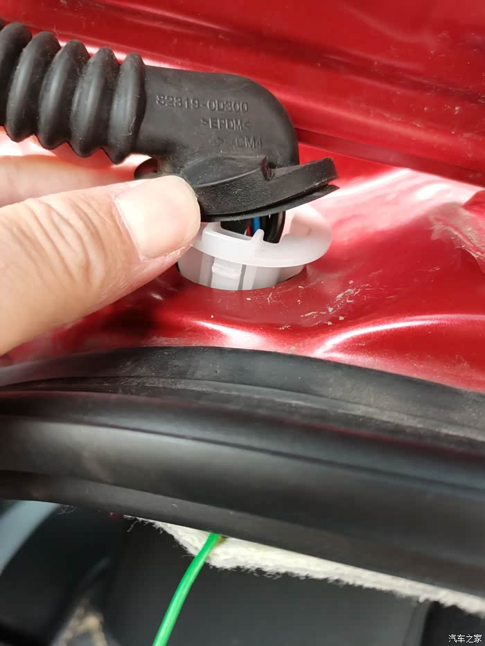 右后大灯组的取电插头,图中指的部位翘起来可以拔出上面小插头,不要蛮力,有倒钩!