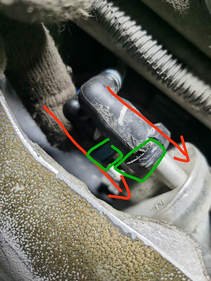 汽滤有三个接头,拆装的步骤都一样,接头往里按到底(红箭头),同时保险扣也往里按到底(绿色框),再反向往外拔出即可。