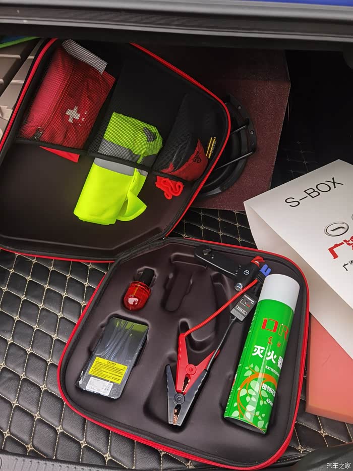 打开应急包,有灭火器,应急电源,反光服,消毒棉,雪糕筒等等
