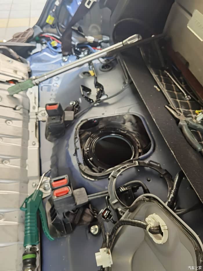 然后用专用工具把油箱顶部的固定圈打开,就可以把整个燃油泵个滤网拿出来了