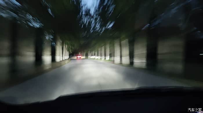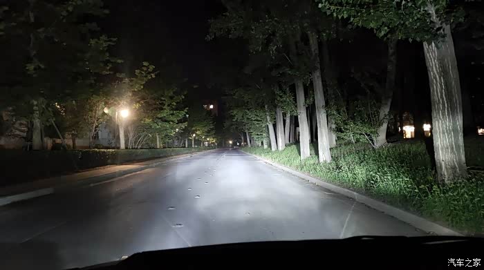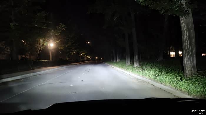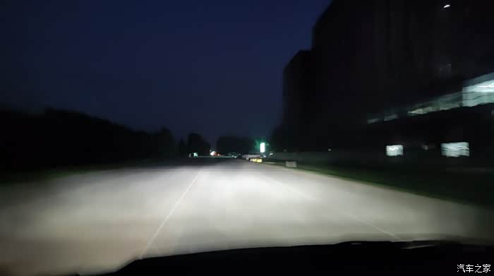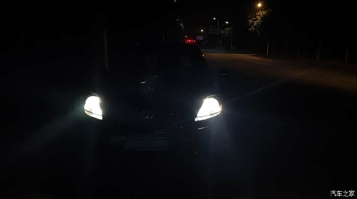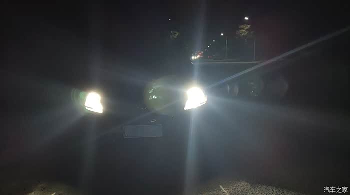 傍晚,开启近光灯。照射高度无原卤素灯泡无异。
