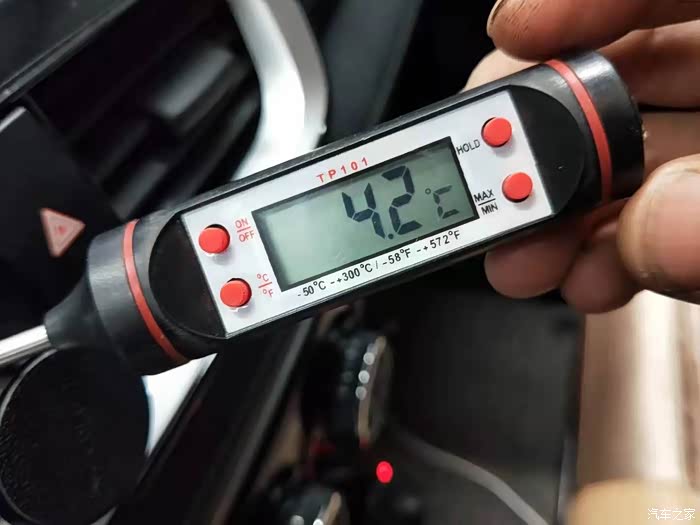 师傅检查空调氟利昂也不少,用气枪从保险杠下面,把水箱前面吹了一下,上面粘了好多毛毛,后来找了一个空调温度计