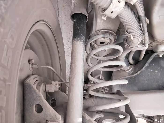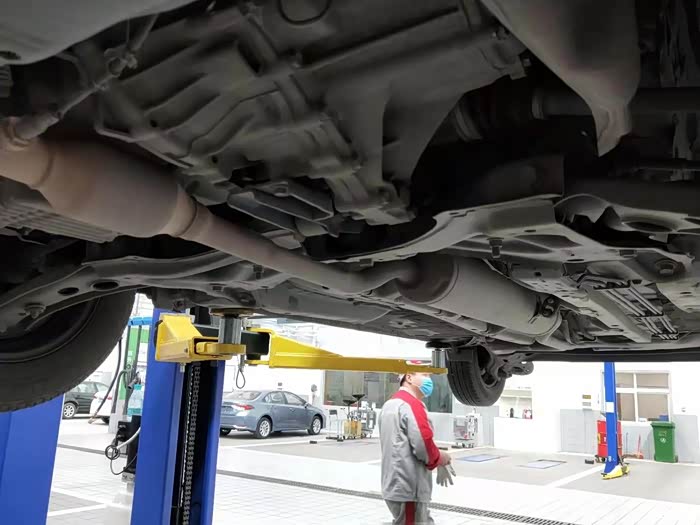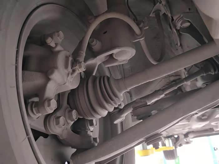 车升起来,下面能站人就好检查车了,四个轮胎检查没有扎钉,不过上面加了很多石子。石子跑起来咯噔响,需要扣掉。