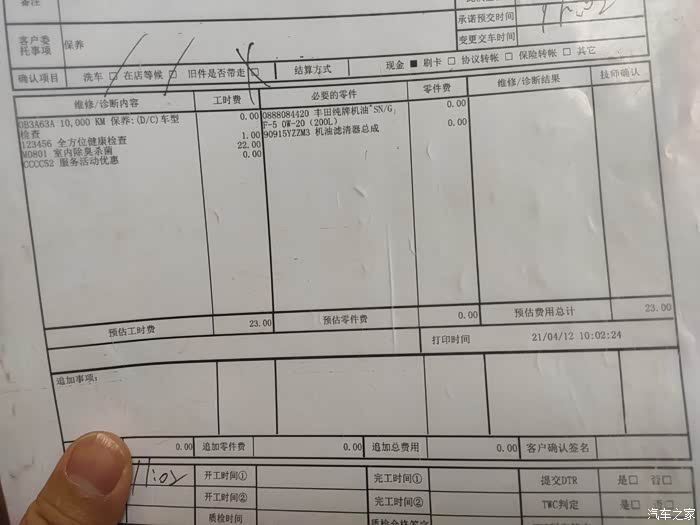 虽然免费,发动机舱,空调滤芯也都给我清理干净,角落里也都检查仔细,做好了全车的安全检查,像灯光啊,底盘啊,这些都是必查项。简单的检查之后。还给我的小威洗干净。这次的首检让我觉得流程还比较正规。等后期做完首保也打算一直在4S店保养,师傅说常规费用四五百这样,也能接受的了。这里的服务都给我很不错的印象,师傅的手艺相对来说更专业更有效率,也比在外面做更安心更有保障吧。