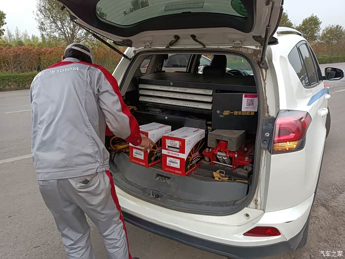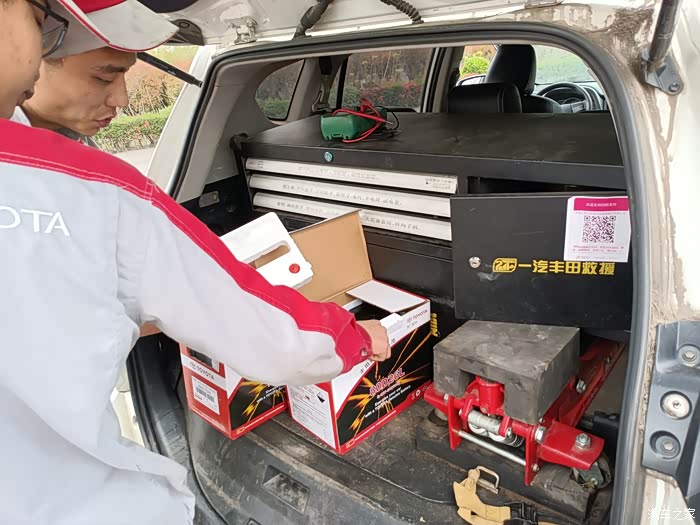 车上搬下来一块电瓶,一会儿要用电瓶线帮车