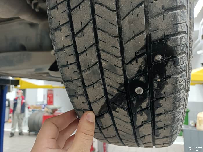 不敢相信一个车轮同一个部位扎了两个钉子,还好这个师傅检查的比较细致
