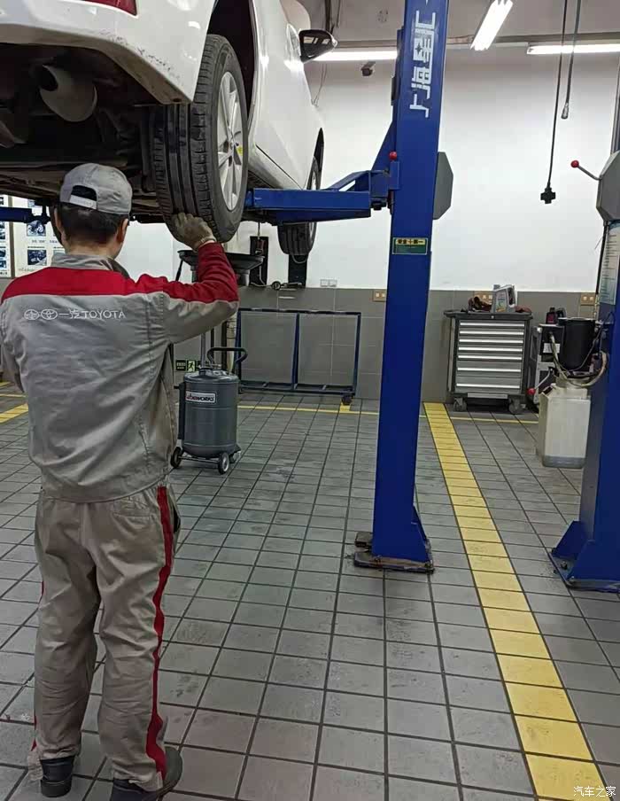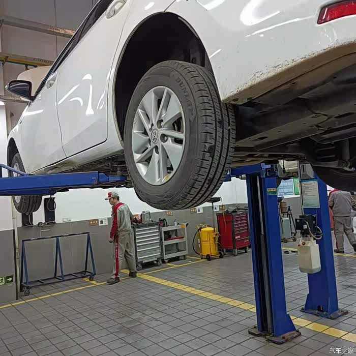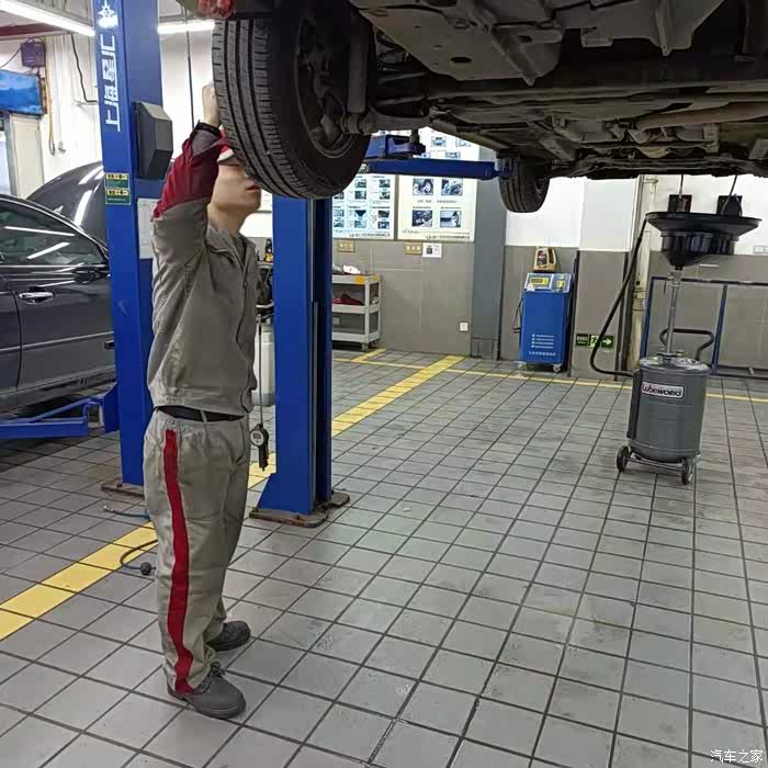 维修师傅在仔细的检测着我的爱车,并确认了我车子的刹车片还在安全的使用范围内,真不得不佩服这款车的刹车片材质,本人小车已经行驶十万公里,目前还未有换过刹车片。