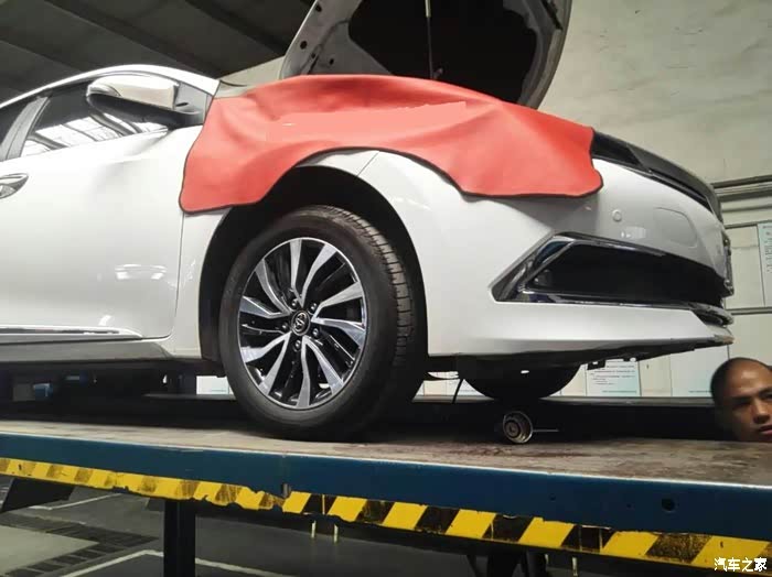 维修人员给我开到工位上,还先给车座套按个座套,怕坐脏客户的车,赞一个。他们开车真猛啊,室内那么小的场地,也一脚轰油门,我真担心撞上,不过貌似技术都?好,一下就停到位置,停的很准。