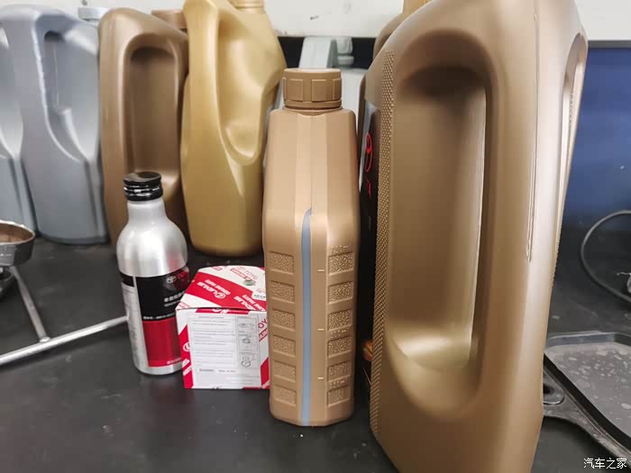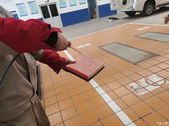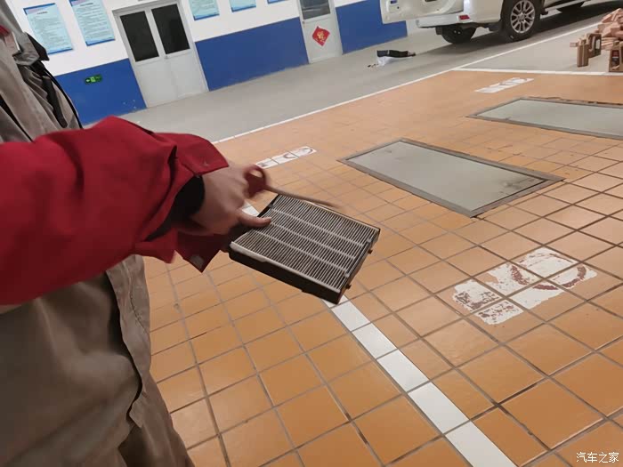 之后让我在休息区休息,给我倒了热水,我再理理待了一会,看了一下展示的东西,就来到了保养工位,看着自己的爱车做保养。车子已经开到了工位,维修什么正在准备需要用的东西,专用的机油,机滤,还有喷油嘴清洗剂,然后给车穿上防护衣,这个是每次保养前必做的项目了,然后给我把机舱里面的尘土用气枪给吹干净,接着师傅把滤芯拆下来,因为时间不长,滤芯不脏,师傅给清理一下还能继续用。