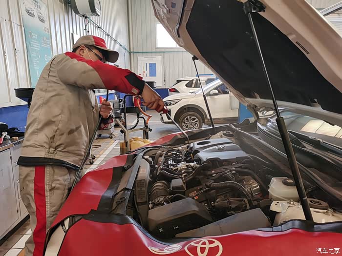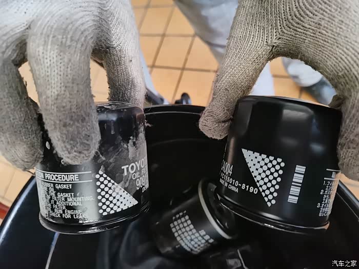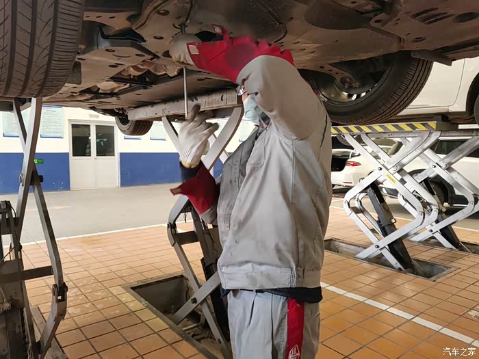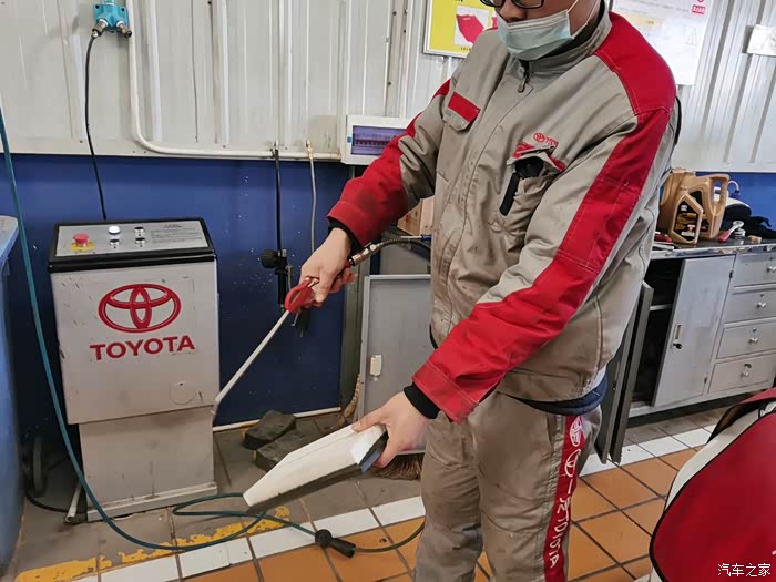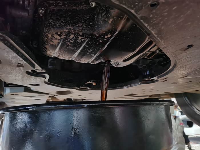 来到之后,一眼就看见了给我做保养的机油机油,空调滤芯和空气滤芯,都是全新未拆包装的,用的东西都是货真价实原厂的东西。车子还是做好了防护,维修师傅把旧的空气滤芯和空调滤芯拆掉之后放在一旁,换上了新的滤芯,之后把车子固定好,升起之后,拆掉下面的护板,放出机油,机油有粘稠度,流出需要一段时间,正好在这期间维修师傅在底盘各处检查,把每个轮胎检查一遍,把每个轮胎上面的石子都清理下来,再把每个轮胎气压补好,很细心,很专业。