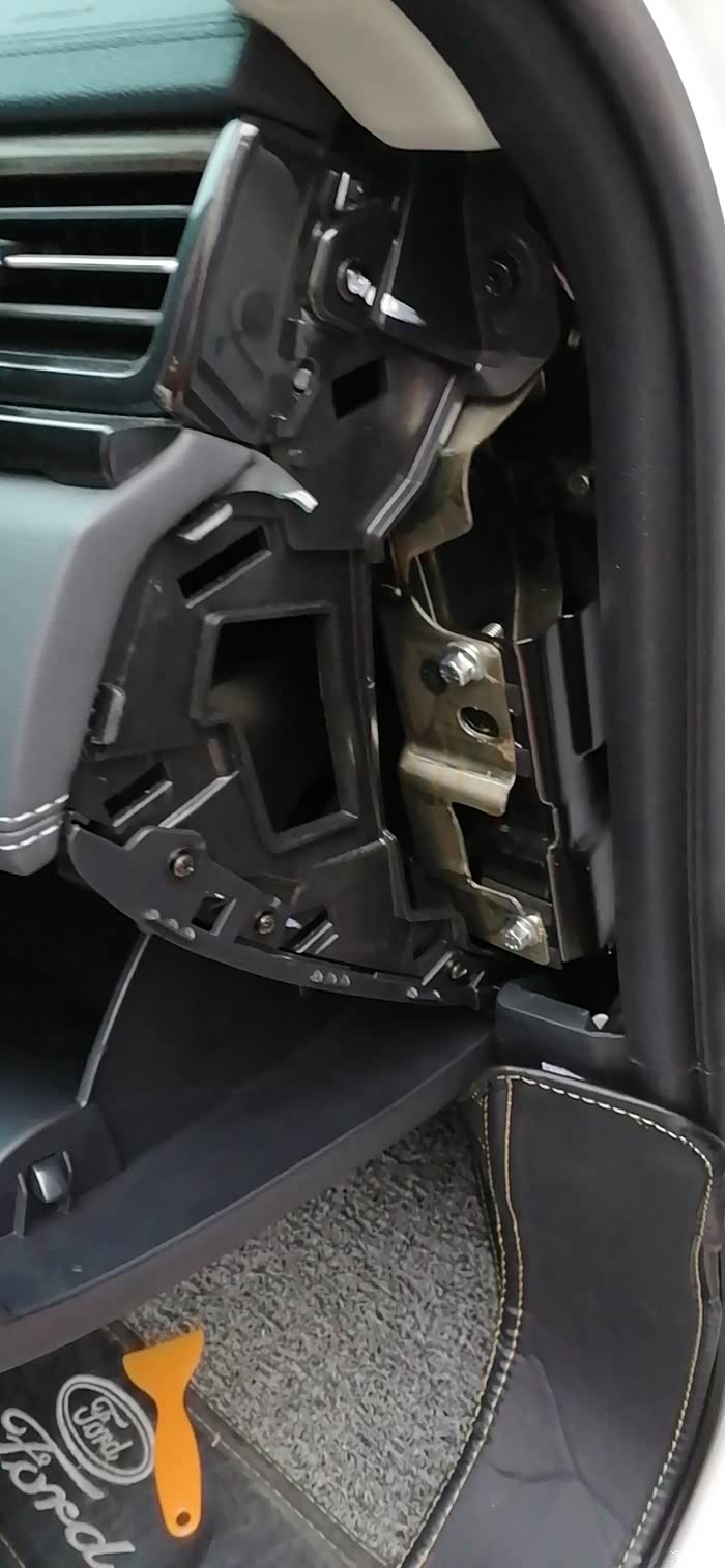 首先卸开手套箱上的四个螺丝,底下还有四个螺丝,拆完螺丝就是往下拽了,刚开始我还不敢硬拽,怕拽坏了。车友说螺丝卸完拽就完了,坏不了,我小心翼翼的又试了几次。终于功夫不负有心人,终于卸下来了。螺丝都很好卸,但是就是手套箱就是不好拽,我到没什么。把车友急得够呛