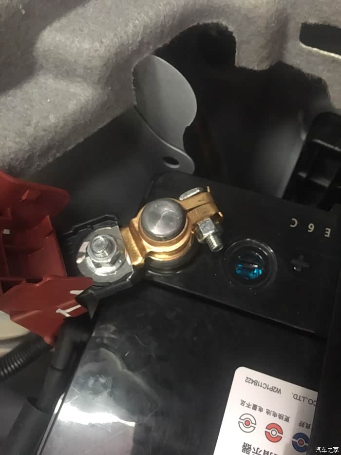 因为原车是小头箍,改成了适应电池大头的固定端子。卸下个螺丝,配个大的铜扎箍就可以了。