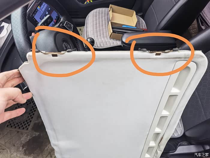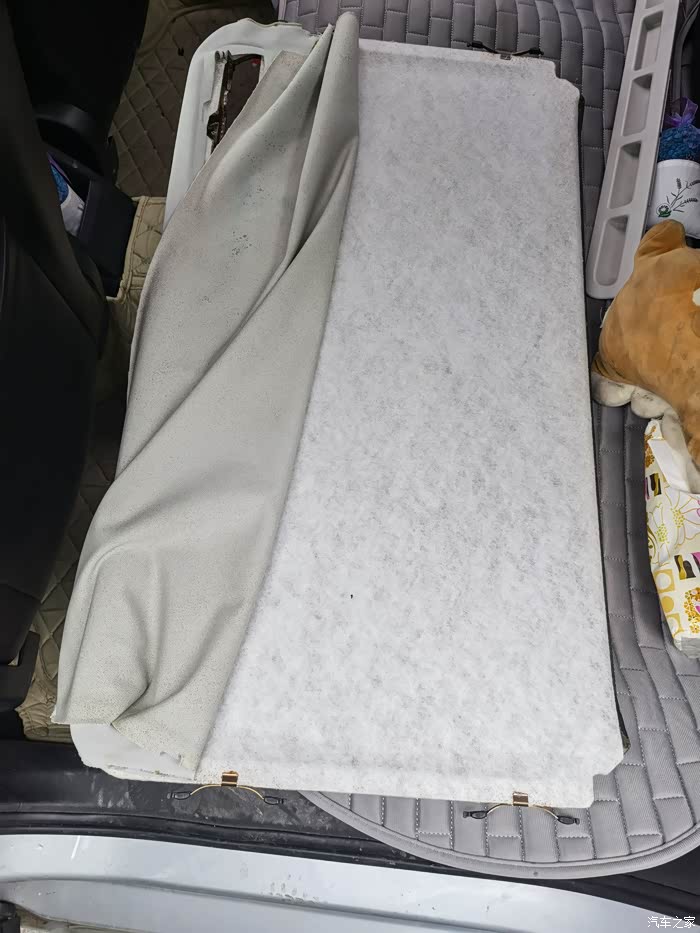 天窗后翘以后两边都有一个这种像手风琴一样的橡胶,里面有5个卡扣,先顺着天窗顶部向下压,就能先把上面两个卡子给拉下来,很轻,几乎不需要力气,不用担心会拉断卡子。