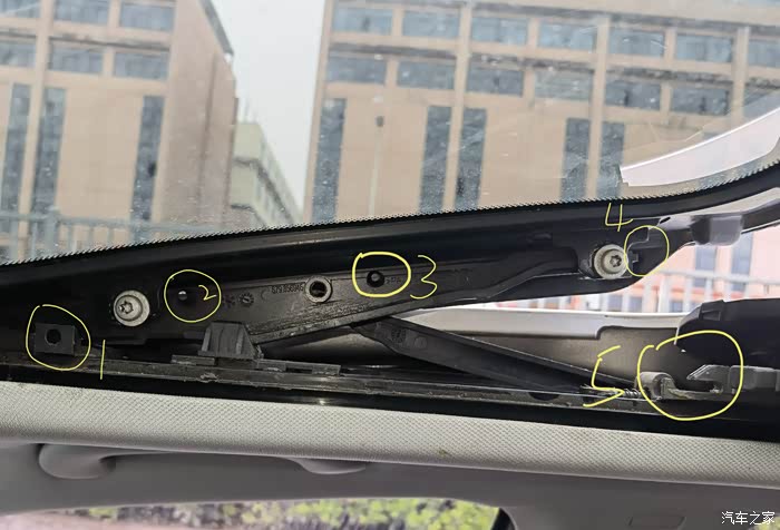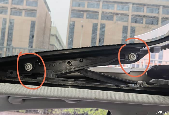 红圈的两颗螺丝,另外一边也是一样,在这里提醒下各位车友,如果有和我同样情况想自己动手的朋友,最好准备一把电动螺丝刀,因为这个位置实在难拆,坐在椅子上高度不够,站有站不起来,手很酸。第二步:拆遮阳