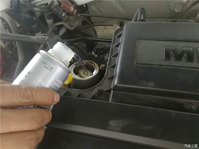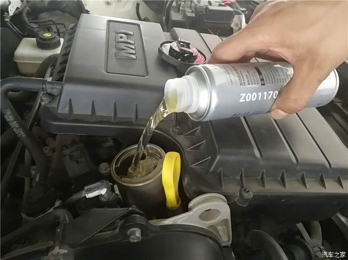 准备往发动机里倒入发动机润滑系统清洗剂。