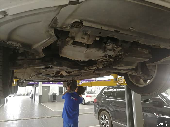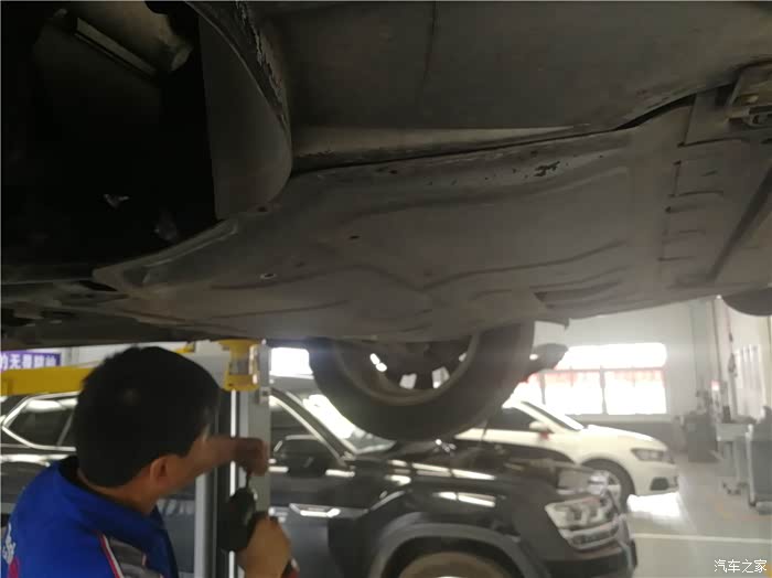 在发动机怠速期间,维修师傅检查爱车底盘,清理石子。