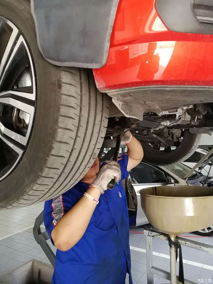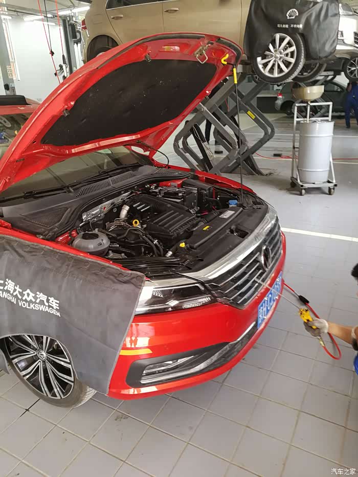上周抽空去4S做了三保,从19年10月至20年6月,距上次二保正好8个月。虽然说全合成机油一般是一万换,综合路况、油样情况、驾驶感受等,这次跑了15000km。提前在“上汽大众大众品牌”微信公众号预约,例行保养,预约成功直接分配了售后顾问,预约时间到店联系售后顾问就可以啦。如果现金支付可以享受预约优惠,公众号还有优惠劵可以用。接车、检查外观、上套、填单,都是例行程序。进车间、开前盖、上架,放油开始,先跟着师傅看下底盘。