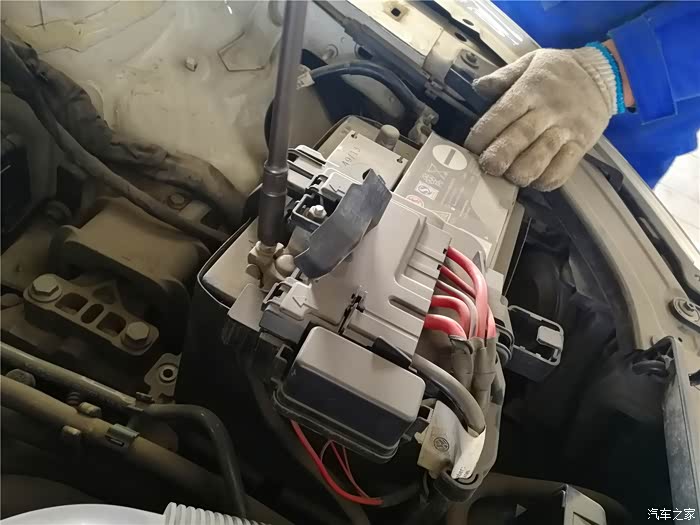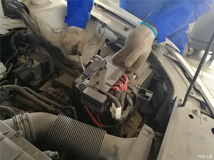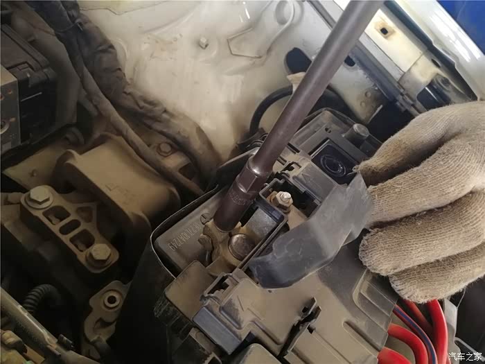 师傅麻利的过来给引擎盖打开,就着手开始拆卸旧电瓶。