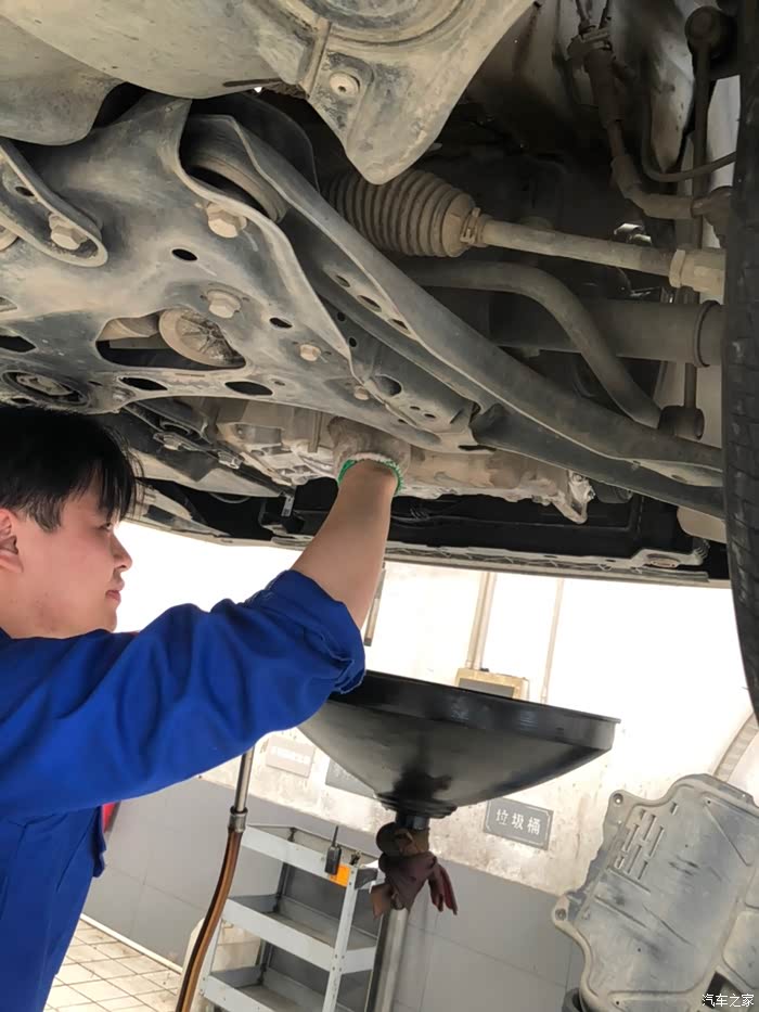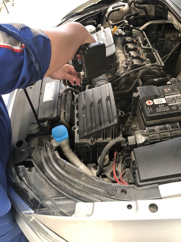 俩个保养师傅,同时操作一个更换新的机油,一个更换空气滤芯,空气滤芯的更换,只需要拆掉空气格盖上的九颗螺丝不用拿下来,然后直接把旧的滤芯拿出来,把新的放进去。