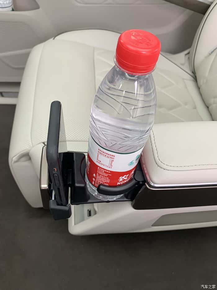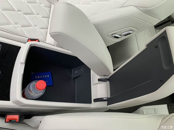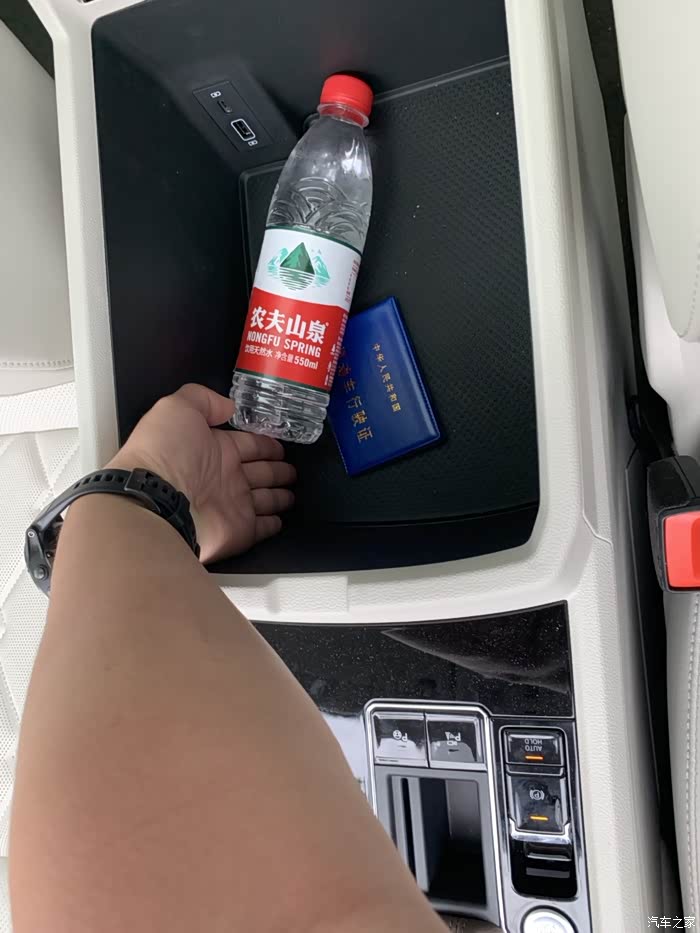 扶手箱很大,也带USB接口,分体的扶手箱盖子,驾驶员这边需要放胳膊,一般不会扣到最低,所以550ml的矿泉水完全可以在这边立起来放。