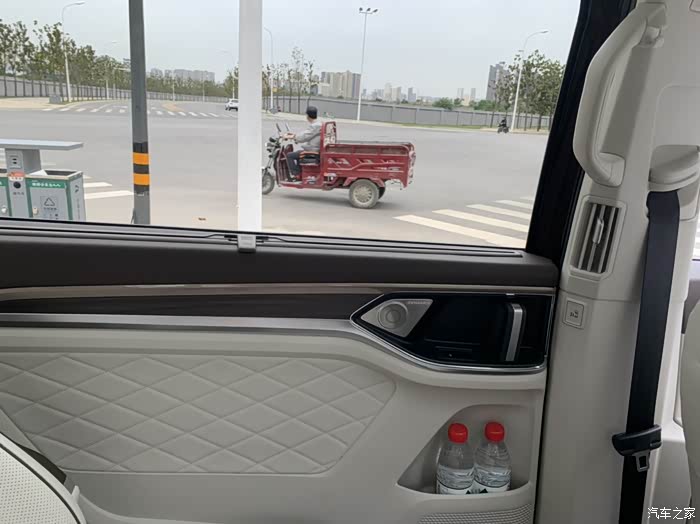 后门板储物一般般,两瓶水塞满。门板质感不错,是皮的,窗户带遮阳帘,拉起来卡在上面就好。门上有开关门按钮,既可以拉把手触发自动开关门,也可以按按钮