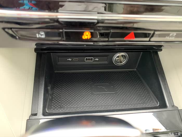 中控区域设计的很合理,最深处有点烟器,一个type C接口和一个USB接口。比途昂那个留在中控屏幕上面的设计合理多了,不会使用过长显得杂乱的连接线。下面带手机无线充电,这样充电和CarPlay两不误