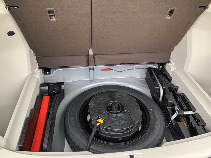 备胎槽里顶配车型带的丹拿音响。盖板下面距离这个轮胎的尺寸也是很大,这地方塞个两三百万现金,盖上盖子,一点问题都没有。平时放放随车工具什么的完全没问题