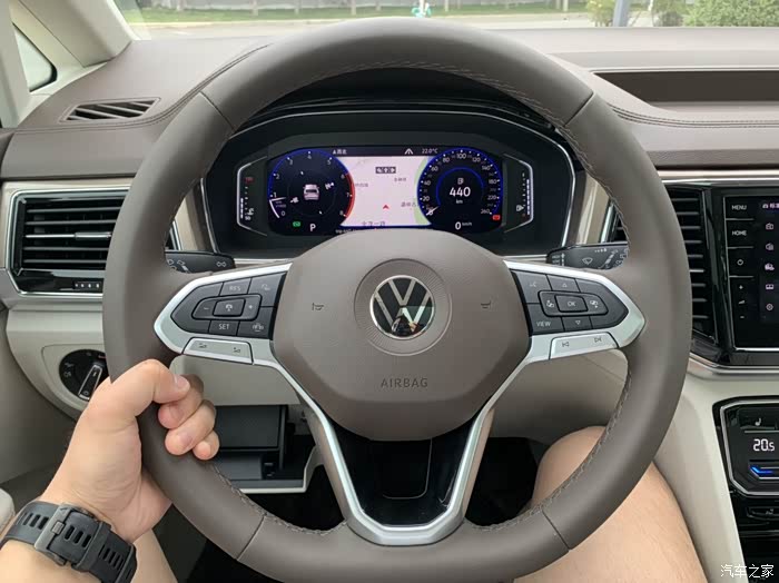 标准的大众风格内饰,现款途昂的大屏加出风口和现款帕萨特的空调控制面板,这行综合一下,看着很舒服,上面大气,下面科技感。