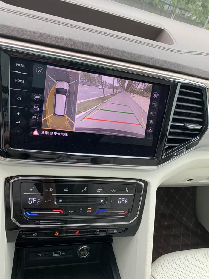 倒车的时候拍了个轨迹,看起来还有360度环影。不会操作,销售已经下去抽烟了。好了,拍的照片就这么多了,总结就是,这是大众弥补自己车型缺失的一款试水车。这款车差不多就是在途昂的基础上进行设计得来的,很多地方有途昂的影子。但是需要说的是,这款车开起来的驾驶感受和途昂完全是不同的调校。同样的380TSI发动机,威然油门极速踩下去提速不如途昂那么直接迅猛,而是有一个思考的时间,然后平和的把车推出去,这和他MPV的定位相符毕竟载着老板或者家人,还是舒适为主。而且底盘的任性要比途昂更加紧实,转弯的侧倾也要比途昂要小很多。大众现在车型的操控都相当不错,不管是帕萨特、途昂还是威然,当你自己开起来的时候,并不像是他们外表尺寸表现的那么大,给我的感觉就像是在操纵一辆紧凑型的SUV。对于我这曾经的大众Polo车主和现在的途安L车主来说,上手完全没有任何的陌生感,也没有对这款极大尺寸的车辆有尺寸判断上的认知障碍。别问我怎么知道途昂的价值感受的,因为在考虑下半年把手里的丰田置换掉。现在威然上市了,我估计我有的好纠结了。