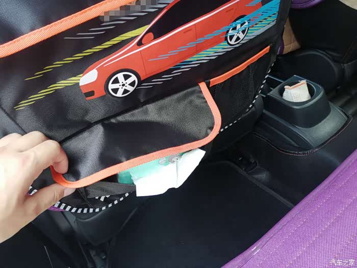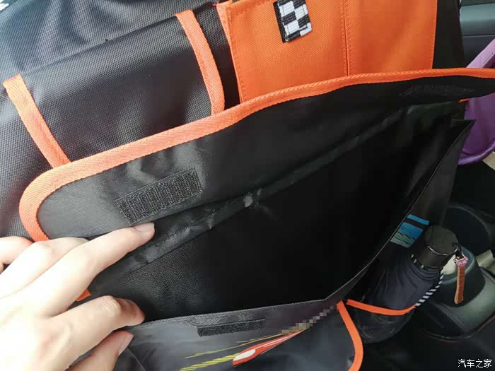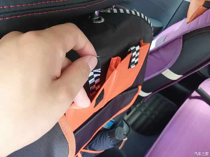 收纳袋是装在前排座椅的背面,这样不占用车内的空间,还把后排的腿部空间给充分利用起来了