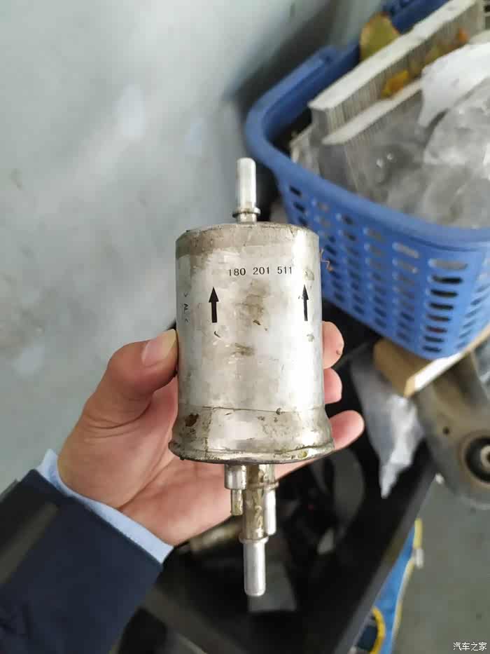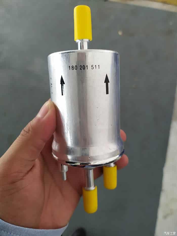 拆下来的原车燃油滤清器,箭头指向是燃油通过方向,零件号:180201511。