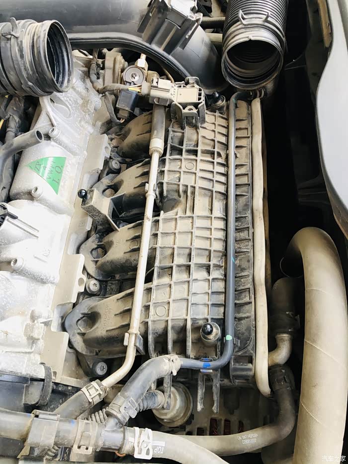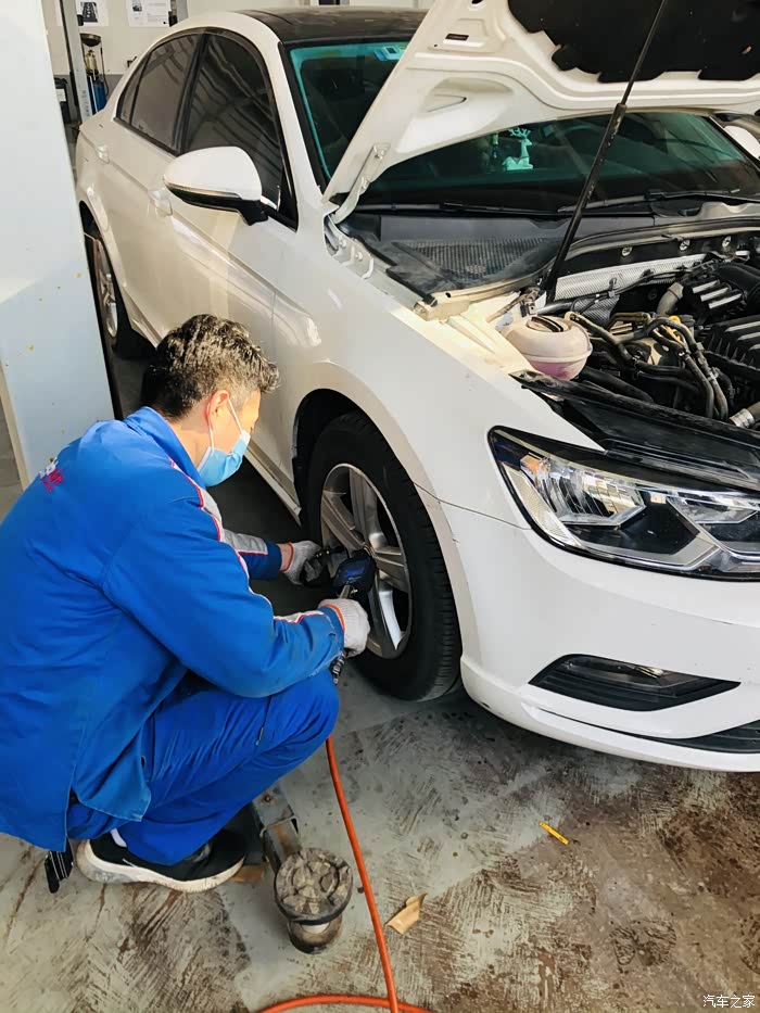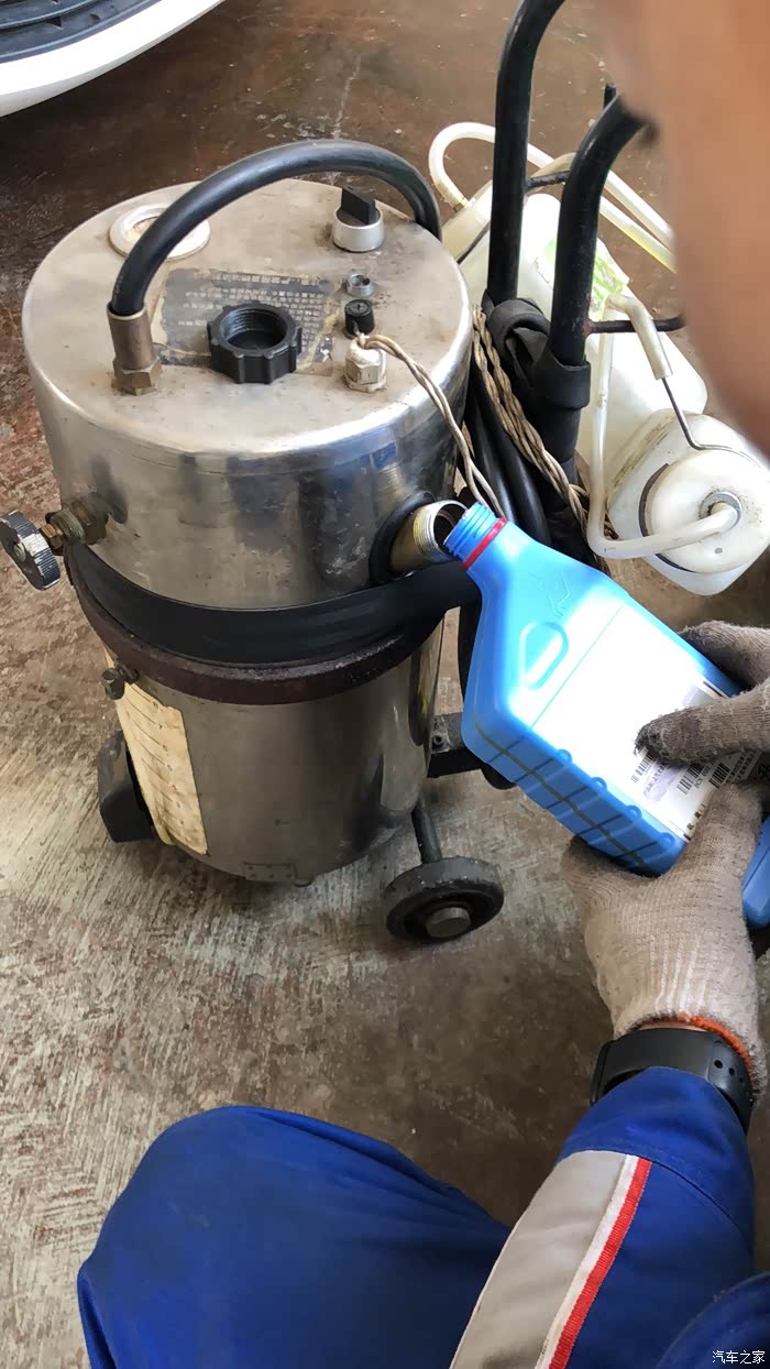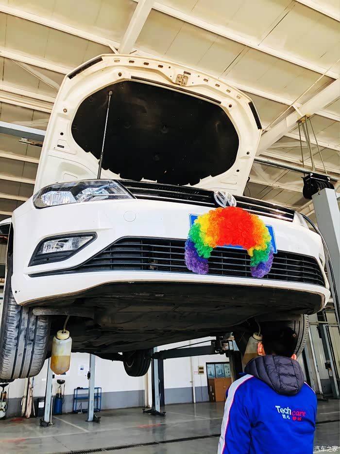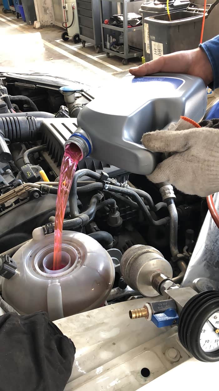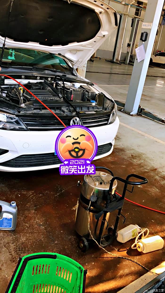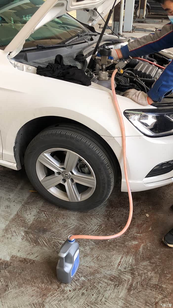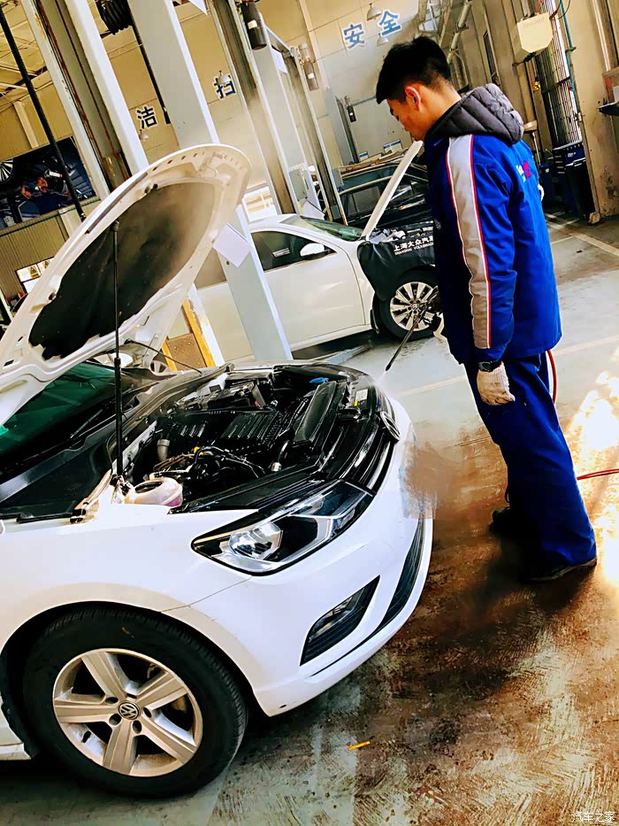 首先师傅把我的小白开到保养车间,我准备给我的小白,加机油,加防冻液,加刹车油,换变速箱油。师傅打开小白前车盖的时候,里面好脏,师傅开始了工作,开始加机油,换新的冷却液,都是原厂的,然后排空气,继续加冷却液,师傅很用心,完成以后更换了原厂的刹车油,空气滤芯不是很脏,师傅说清理一下就可以啦,下一次换新的。