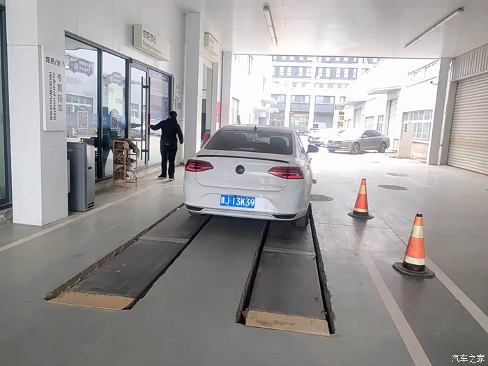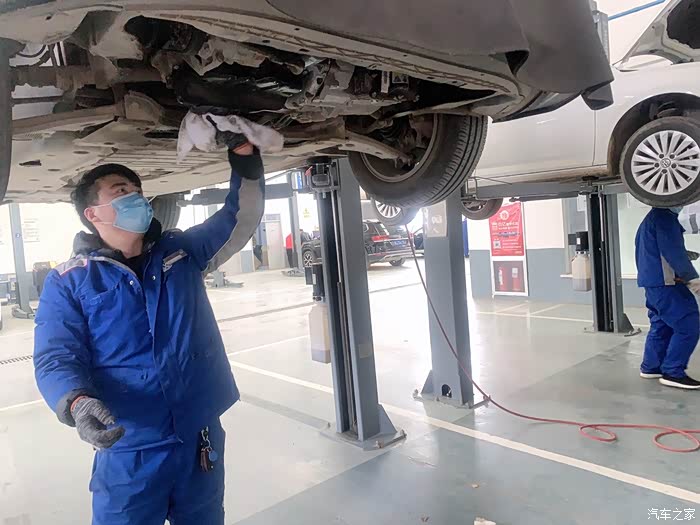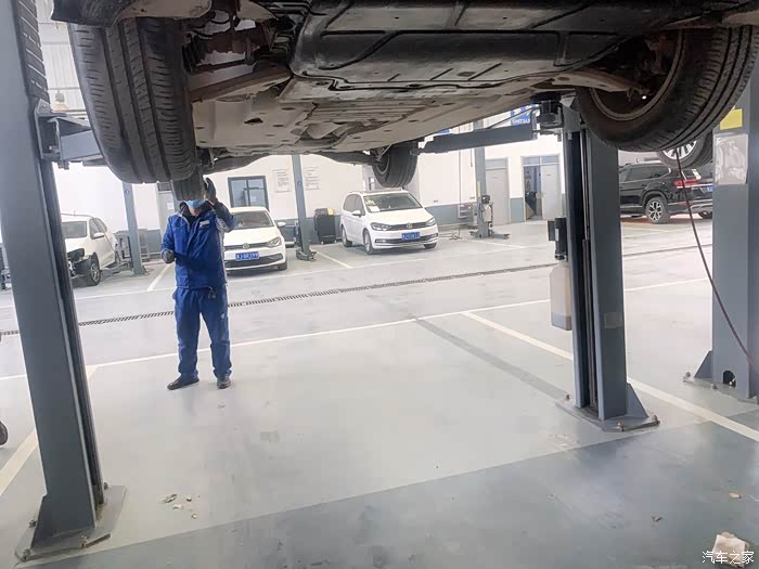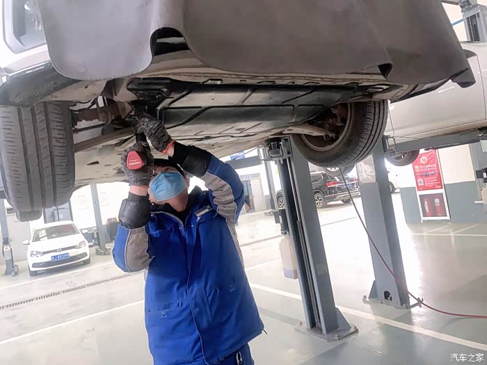 开始轮胎检测,工作人员把四个轮胎检查了一遍,然后把车底螺丝也做了认真的检查。