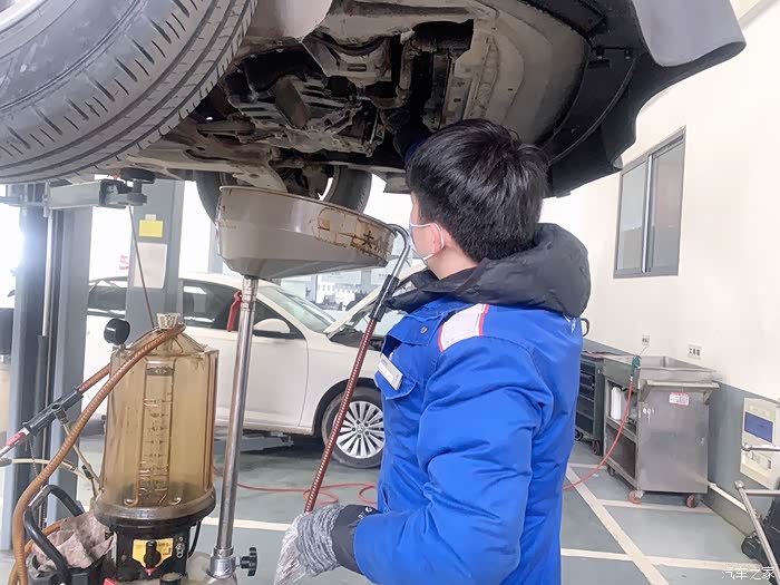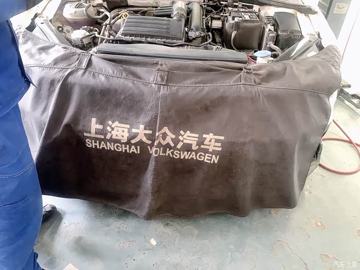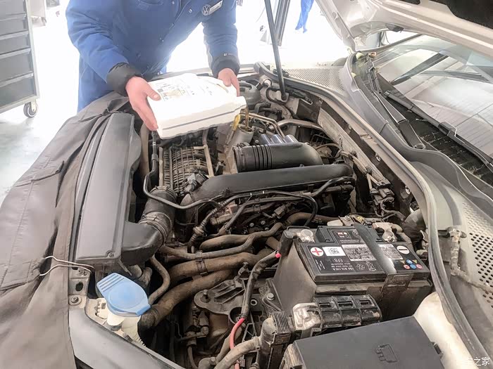 一大桶原装的上汽大众品牌的原厂机油被注入。