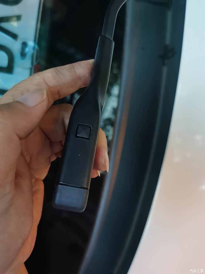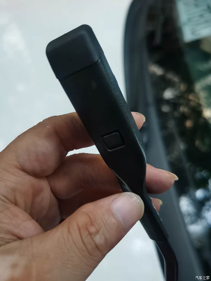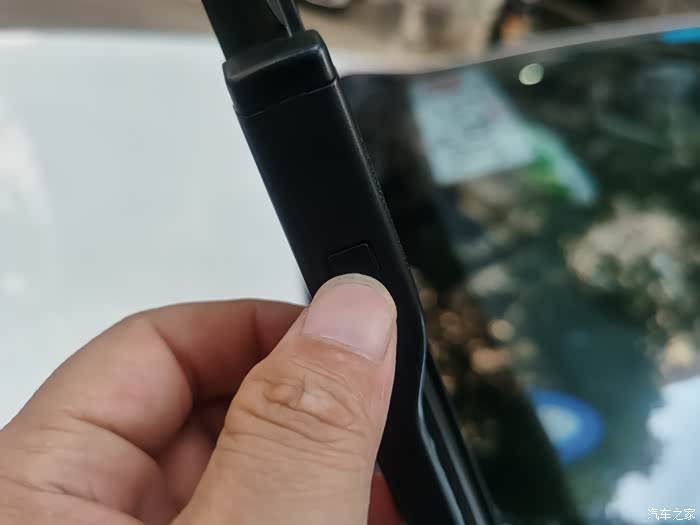 如图所示,按下小方格的同时用力往上一提,就可以把雨刮器从雨刮臂上分离出来。
