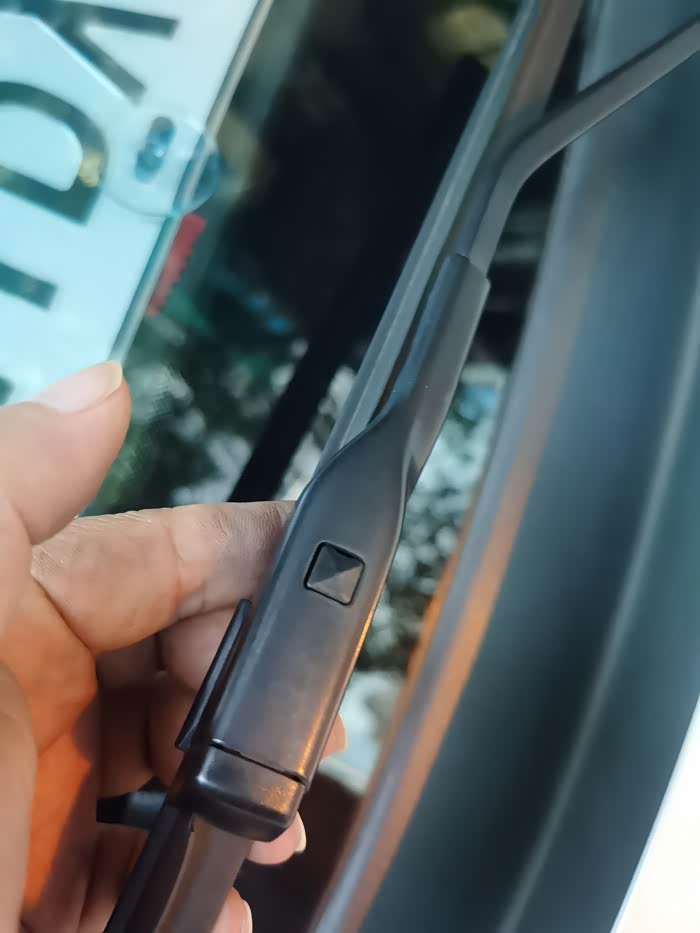 以我的大众朗行为列就属于直插式里的暗扣式接口,首先抬起雨刷臂,然后按下雨刷臂中间的小方格。