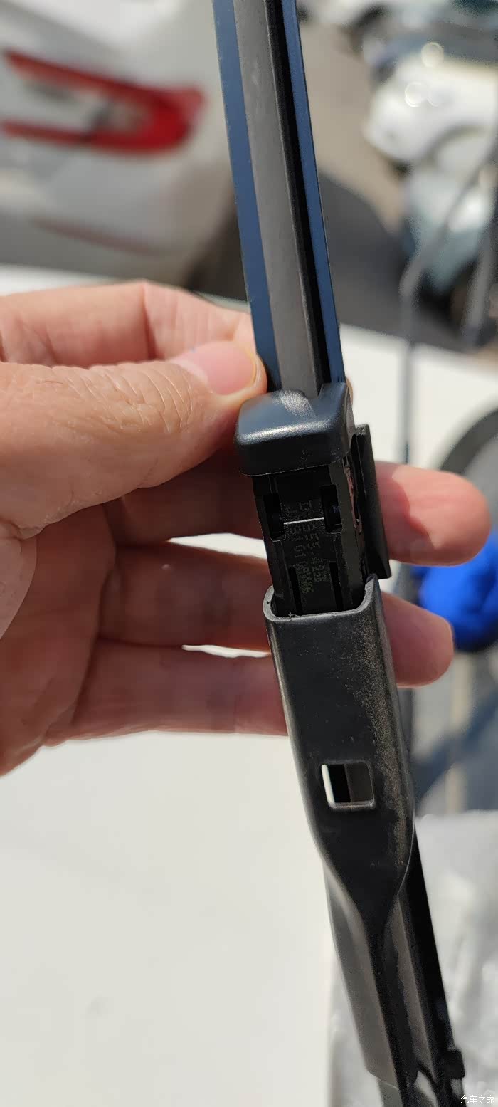 把这个小方块按下去的同时,用力将雨刷片向外拉。雨刷片就从卡槽里出来了。同样方法把另一个雨刷片也拿下来。
