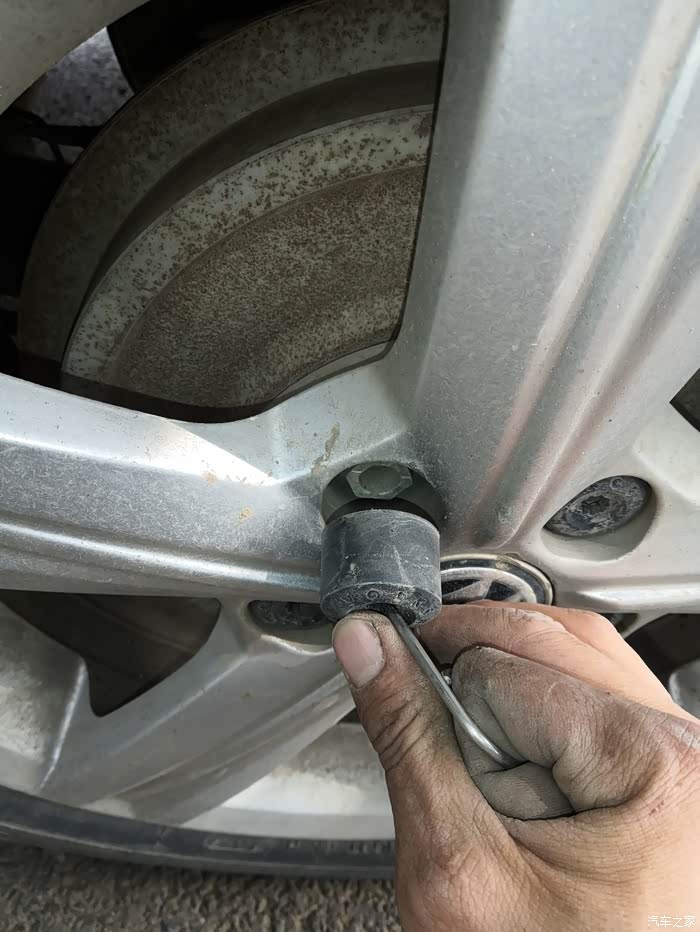 然后先不要着急用千斤顶顶车子,先把车轮防盗冒拆下来把车轮的螺丝松开之后再升顶。要不然升起顶了,螺丝太紧用不上劲了。