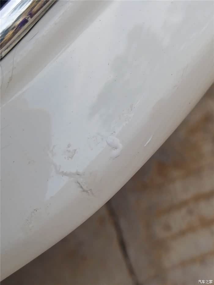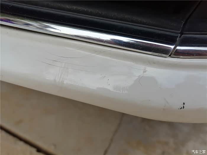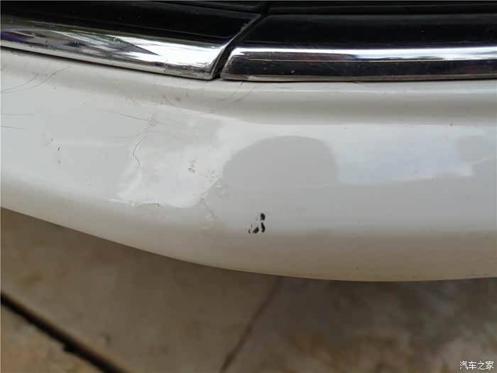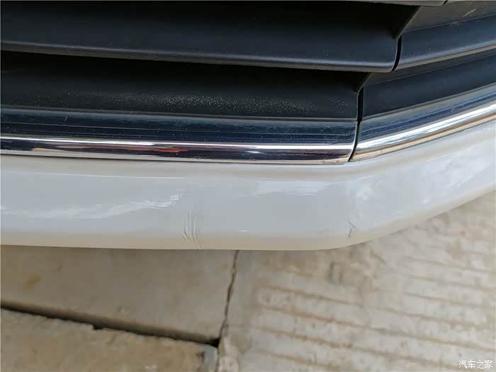 凑近了看看,前唇发现一处小伤,这是我在一次停车时,腾挪车辆,没有注意前方的一块儿石头,怼上的。伤的不轻,略有变形,不近看也注意不到这个位置。
