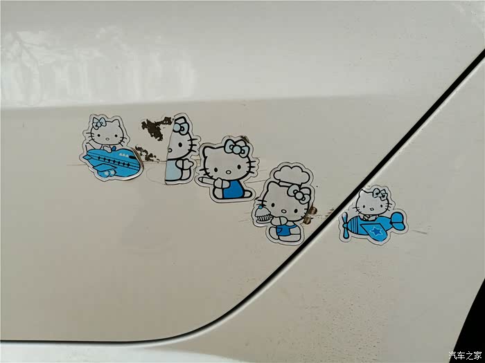 左后侧车门处,我粘了贴纸遮挡划痕。这处伤痕时间比较久了,具体怎么剐蹭的,至今不知缘由。