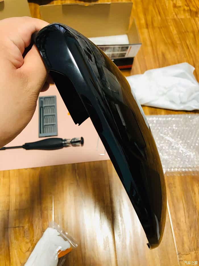 下订单。没两天就到货了,拆箱验货。原厂壳喷亮黑色。右边的完美,左边的有点小问题(喷漆喷的里面感觉有点杂质),电联卖家可能是因为疫情总没人接,好在最后回我了,很痛快的给我又邮寄了一个过来。第二次这个完美。耳朵搞定了