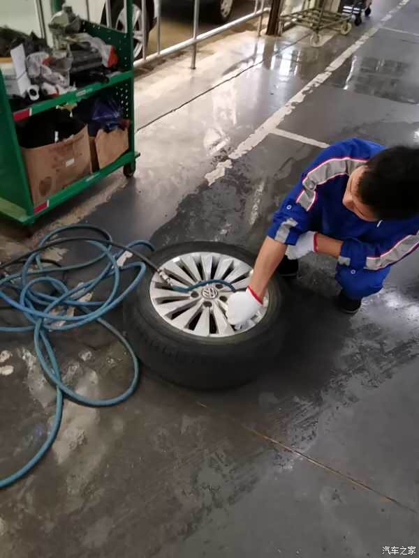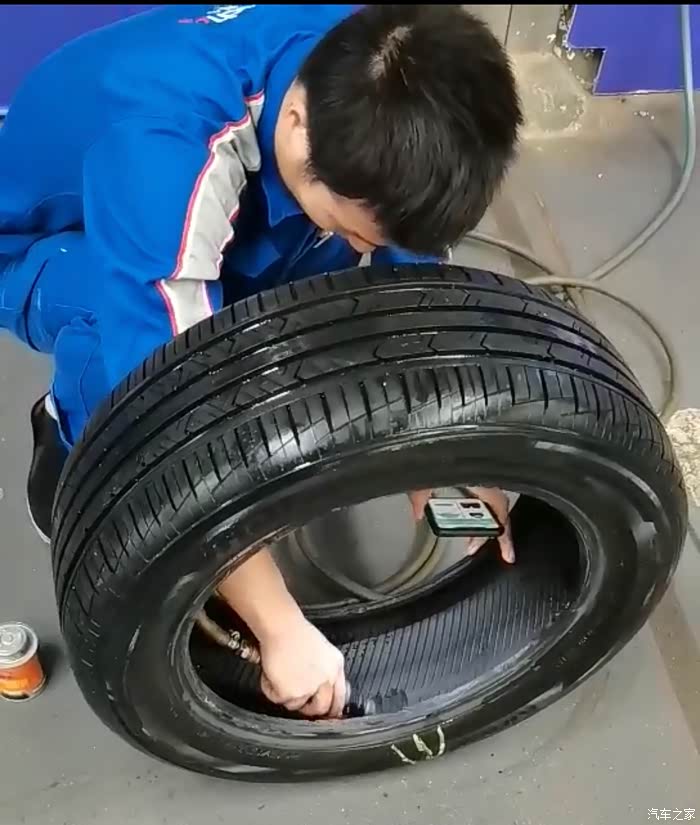 师傅在很认真的找寻扎胎的钉子