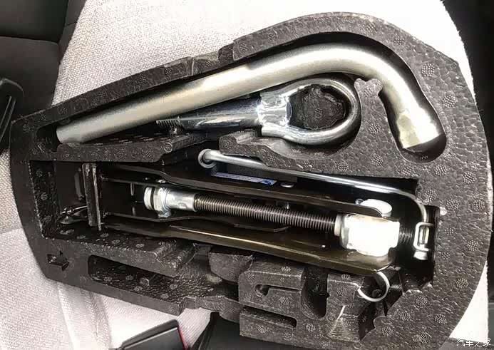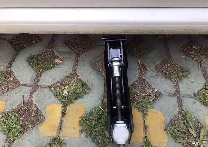 首先把千斤顶从后备箱内取出,按照要求放置在车底侧面内的小三角形标志位置。
