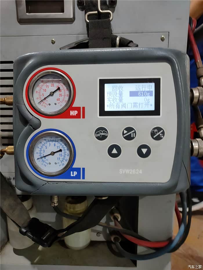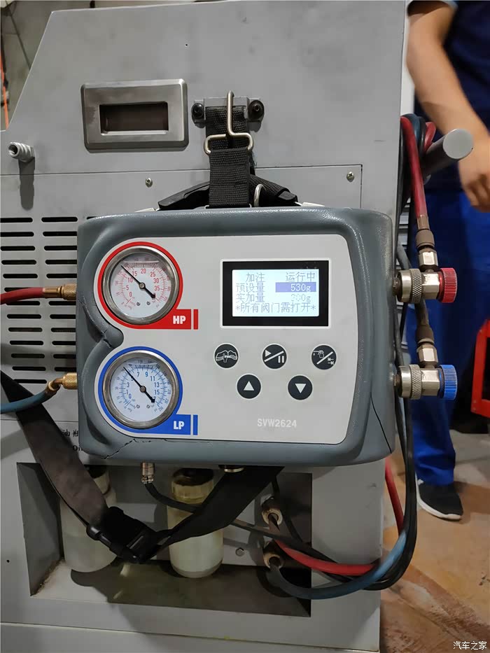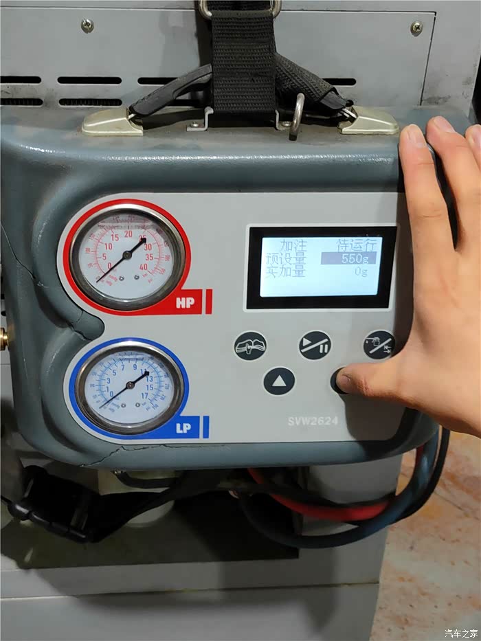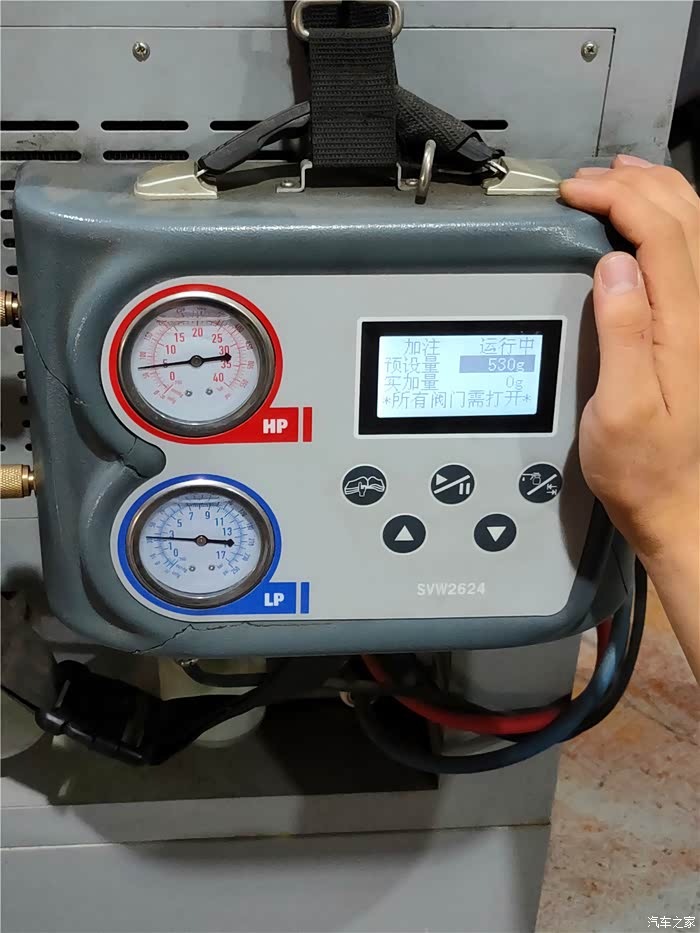 根据车辆空调标注的冷媒最大容量,在冷媒回收加注机上设定好加注容量,我家老狼的冷媒容量被设定为550g。