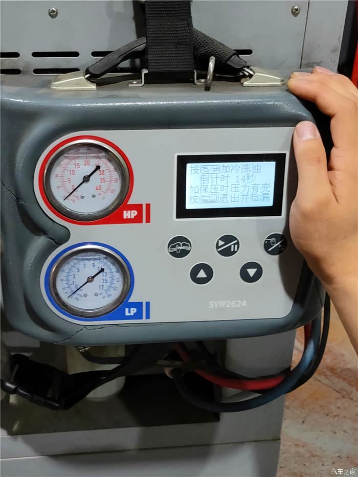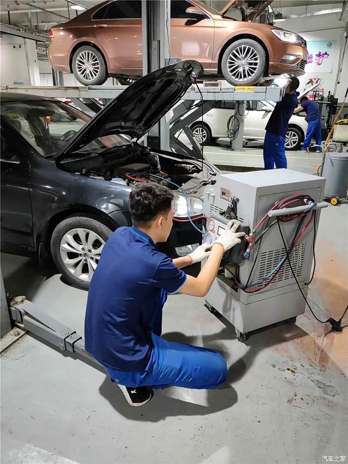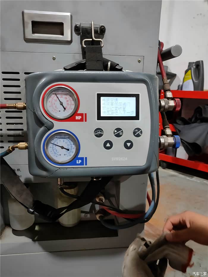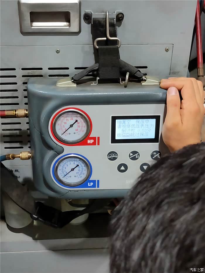 在维修师傅检查空调滤芯的时候无意中发现刚才完成冷媒加注的机器自己还在一边进行自我管路的清理。