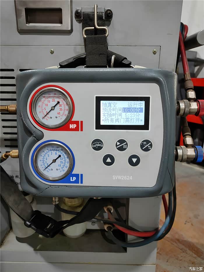 将管路都连接号以后,等待冷媒回收加注机开机自检完成之后便开始对老狼的空调进行抽真空处理