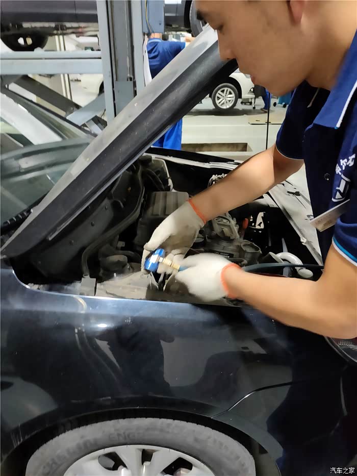 维修师傅按照提示将红色和蓝色的高低压岐管从车辆上取下