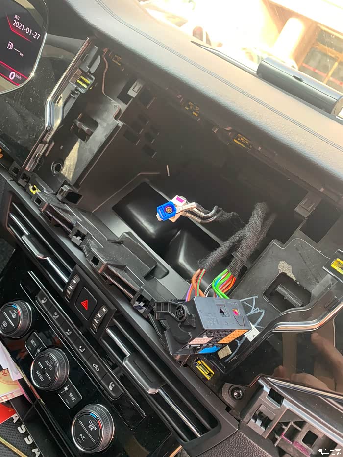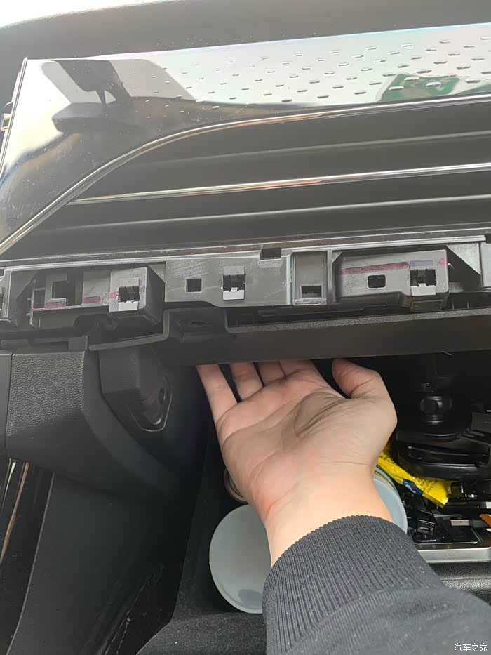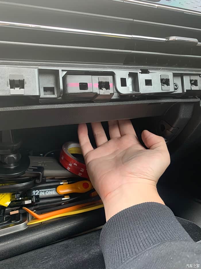手套箱上部左右两边有可按压的卡子,往上按可以拆手套箱,回头好走线。