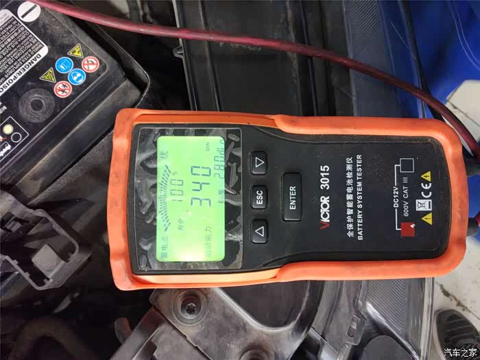 蓄电池启动能力检测。我的蓄电池是骆驼的,这次检查数值是340,标准是280以上,电池还是蛮好的。